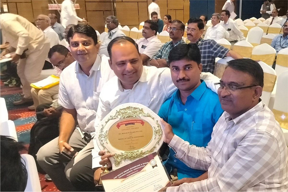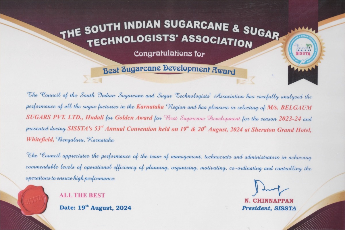 M/s Belgaum Sugars Pvt. Ltd., Hudali recived Golden Award For Best Sugarcane Development for the season 2023-24 and presented during SISSTA's 53rd Annual Convention 2024.