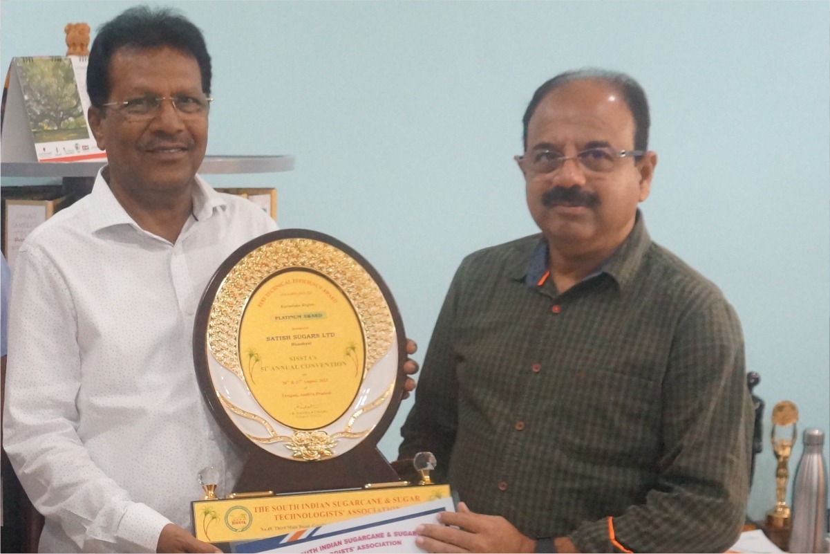 M/S Satish Sugars Ltd., Hunshyal P.G., recived Platinum Award for Best Technical Efficiency Award for the Season 2021-22 and presented during SISSTA's 51st Annual Convention 2022.